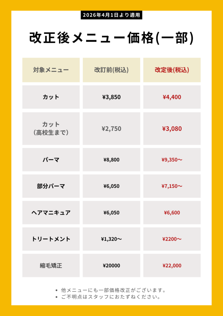 このたび材料費などの高騰により、2026年4月1日(木)より一部メニューの価格を改正させていただきます。